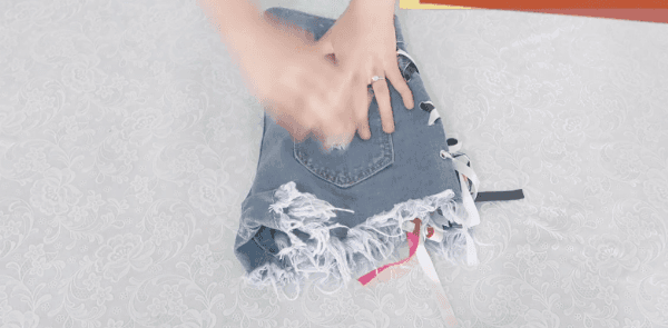 先把短褲對(duì)折,再將臀部比較寬的部位往里折一下,形成矩形;
