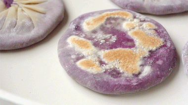 6、小火加熱平底鍋,下紫薯餅每面烙個2分鐘至其呈現金黃色,出鍋。
