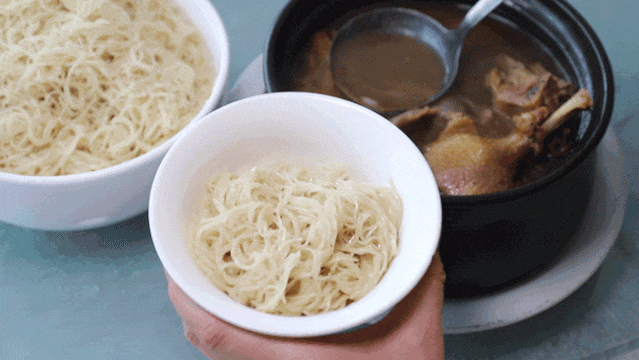 05、待鴨肉軟爛時(shí),取另一只鍋汆燙白面線,即時(shí)加入鴨湯中即成鴨肉面線。