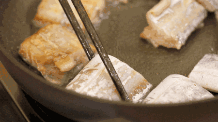 01、將海鱸魚切塊,用料酒、生抽、老抽、鹽等調(diào)料腌制片刻,然后入鍋煎至兩面金黃。
