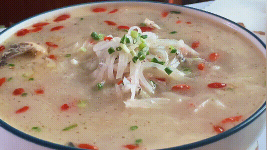 04、起鍋前撒上枸杞和蔥花,再裝入湯碗中,鮮美可口的蘿卜絲鯽魚(yú)湯,完成。