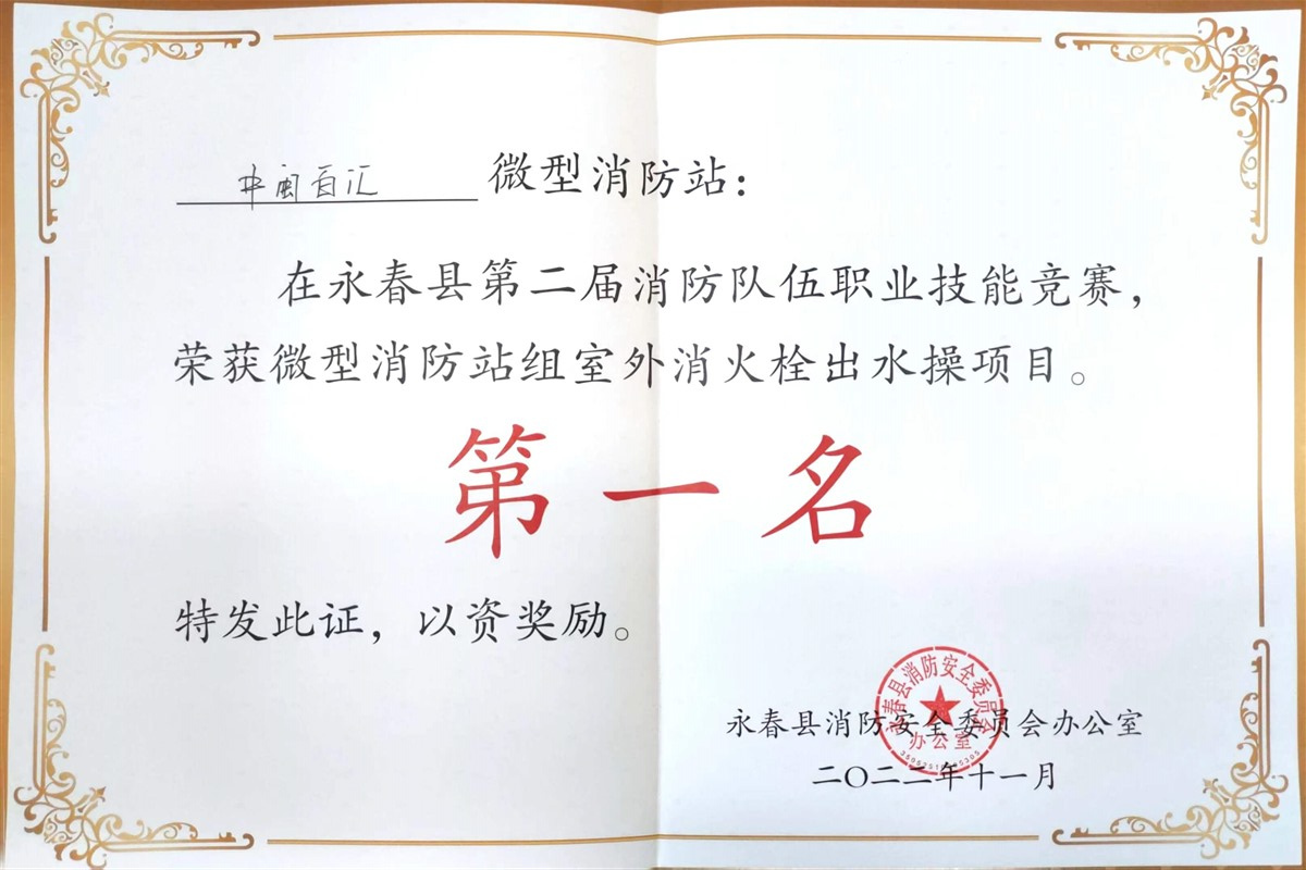 永春縣第二屆消防隊伍職業(yè)技能競賽微型消防站組室外消火栓出水操項目第一名