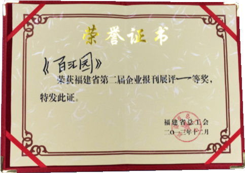 百匯園榮獲省第二屆企業(yè)報刊展評一等獎獎狀