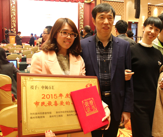 2016年2月23日,中閩百匯在2015年度泉州經(jīng)濟年會中,獲評“十佳市民最喜愛的品牌企業(yè)”,總裁公司陳開通、營運部總監(jiān)簡愛紅、市場部總監(jiān)劉巧紅應(yīng)邀參加此次盛會。泉州經(jīng)濟年會每年舉辦一次,由中共泉州市委宣傳部以及泉州市經(jīng)信委、科技局、商務(wù)局、工商局、工商聯(lián)、泉州晚報社等聯(lián)合主辦,是泉州一年一度最具權(quán)威的經(jīng)濟盛事。