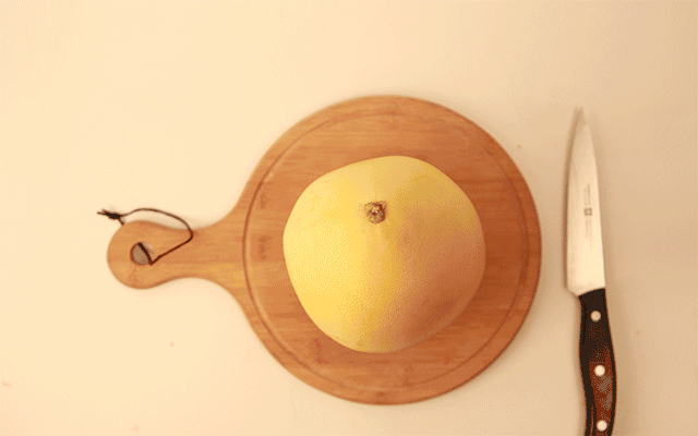 再豎向劃一刀,也是一厘米深,輕輕分離上半部分表皮;將拇指伸進下半圈表皮,旋轉一周就能將柚子完整取出,得到一個半圓(可以用做小碗裝柚子的內(nèi)皮)。