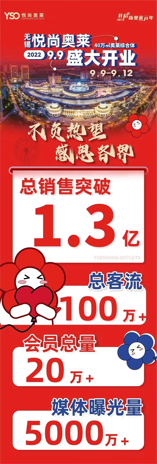 作為中閩百匯與明發(fā)集團(tuán)強(qiáng)強(qiáng)聯(lián)手的作品,在25年深耕零售業(yè)的豐富經(jīng)驗(yàn),以及優(yōu)質(zhì)項(xiàng)目區(qū)位優(yōu)勢(shì)的加持下,2022年9月9日,無(wú)錫悅尚奧萊盛大開業(yè),在為當(dāng)?shù)丶爸苓叧鞘凶⑷肷虡I(yè)新活力的同時(shí),并一舉創(chuàng)下了全國(guó)奧萊“體量之最”,全國(guó)零售商業(yè)“存量改造之最”等新紀(jì)錄,為國(guó)內(nèi)奧特萊斯乃至零售商業(yè)如何打造全業(yè)態(tài)復(fù)合型商業(yè)空間,起到了領(lǐng)先的示范作用。據(jù)無(wú)錫悅尚奧萊官方信息顯示,項(xiàng)目在9月9日-9月12日開業(yè)四天總銷售額突破1.3億元,總客流100萬(wàn)+,會(huì)員總量20萬(wàn)+,媒體曝光量5000萬(wàn)+,亮眼的數(shù)據(jù)為項(xiàng)目今后的長(zhǎng)足發(fā)展贏得了開門紅。