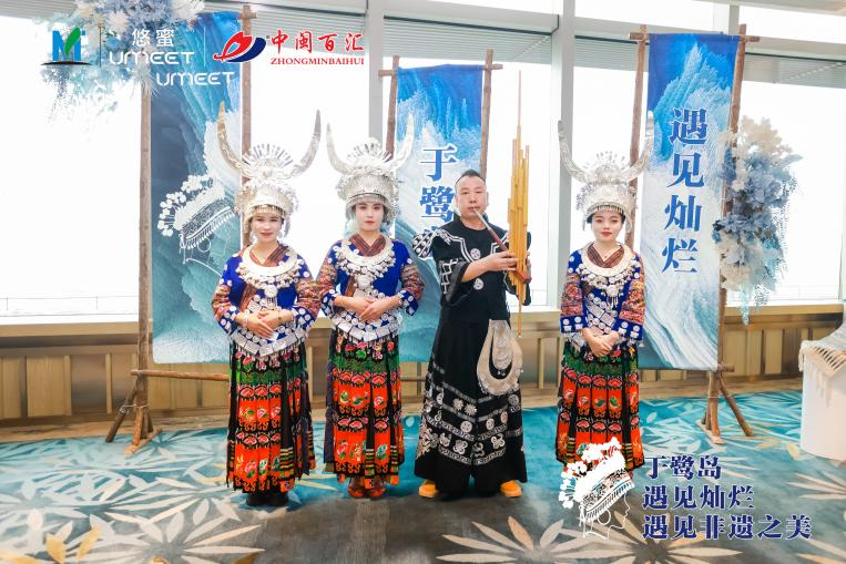 品鑒會暖場階段,苗族姐妹身著華麗盛裝和銀飾在燈光下裙袂飛揚(yáng),在蘆笙節(jié)律中踏步起舞,帶領(lǐng)大家感受了苗族熱情活力的迎客之道;嘉賓現(xiàn)場體驗(yàn)貴州蠟染、海絲泉州蟳埔簪花圍的非遺魅力。